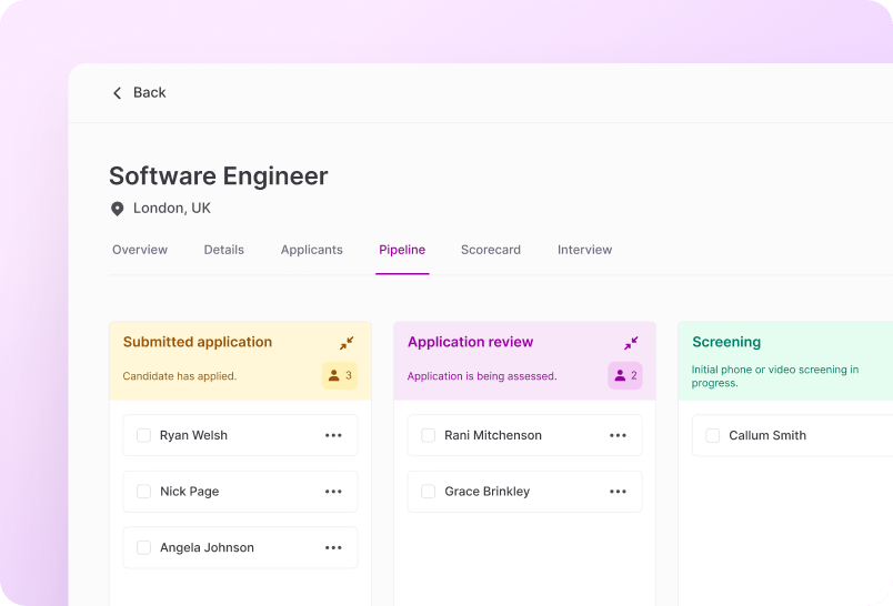 View your applicants by pipeline stage, then review and rank your candidates to build a shortlist, move them through stages, and send job offers or rejections.