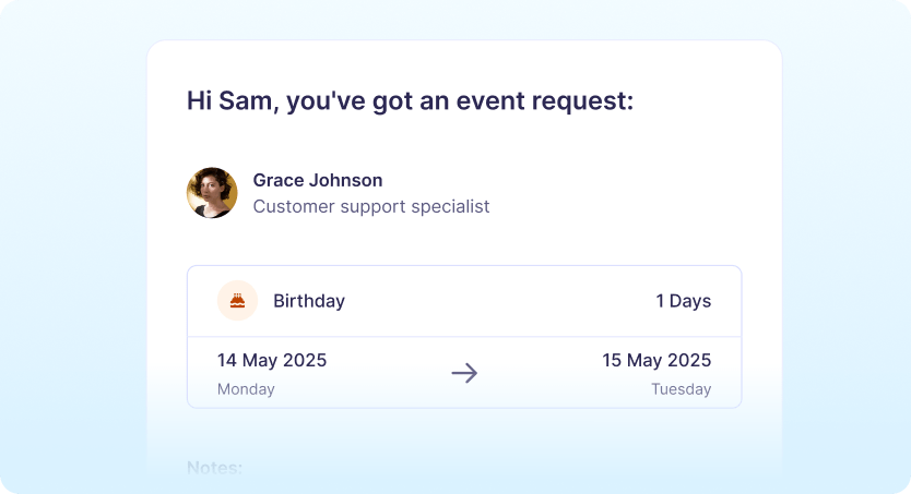 Give your team the freedom to request time off and track events, while you stay in control with custom policies, automated approvals, and unlimited event types.