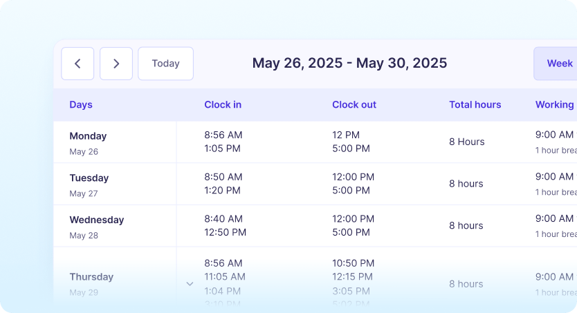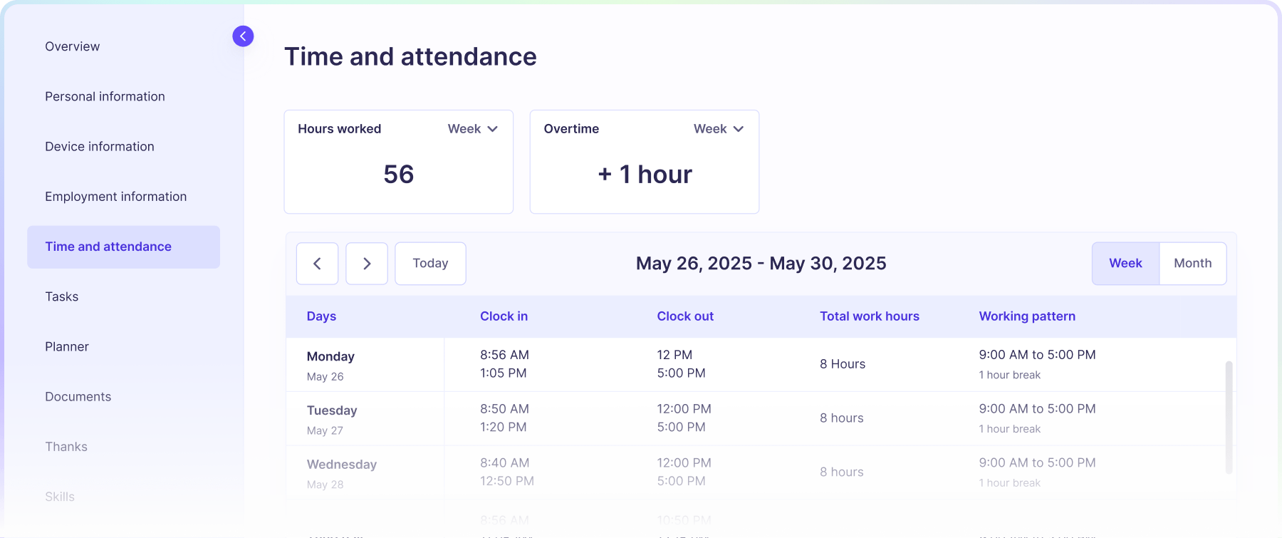 Set your own shift patterns, break allowances, grace periods and more - and let SenseHR handle the calculations when people clock in or out.